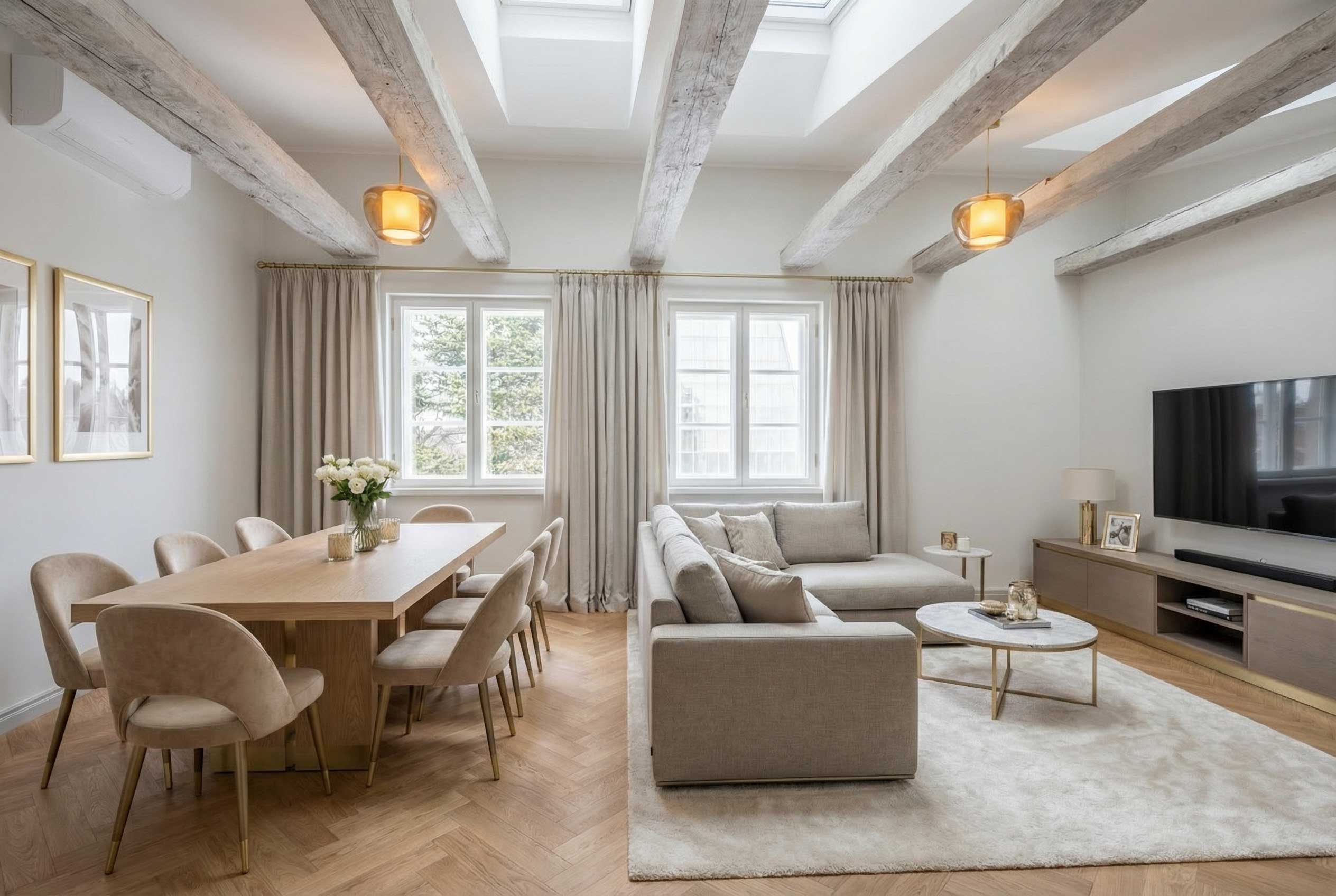 Naturaalne tamm · Rahulik värvipalett · Kivipind ja messingdetailid